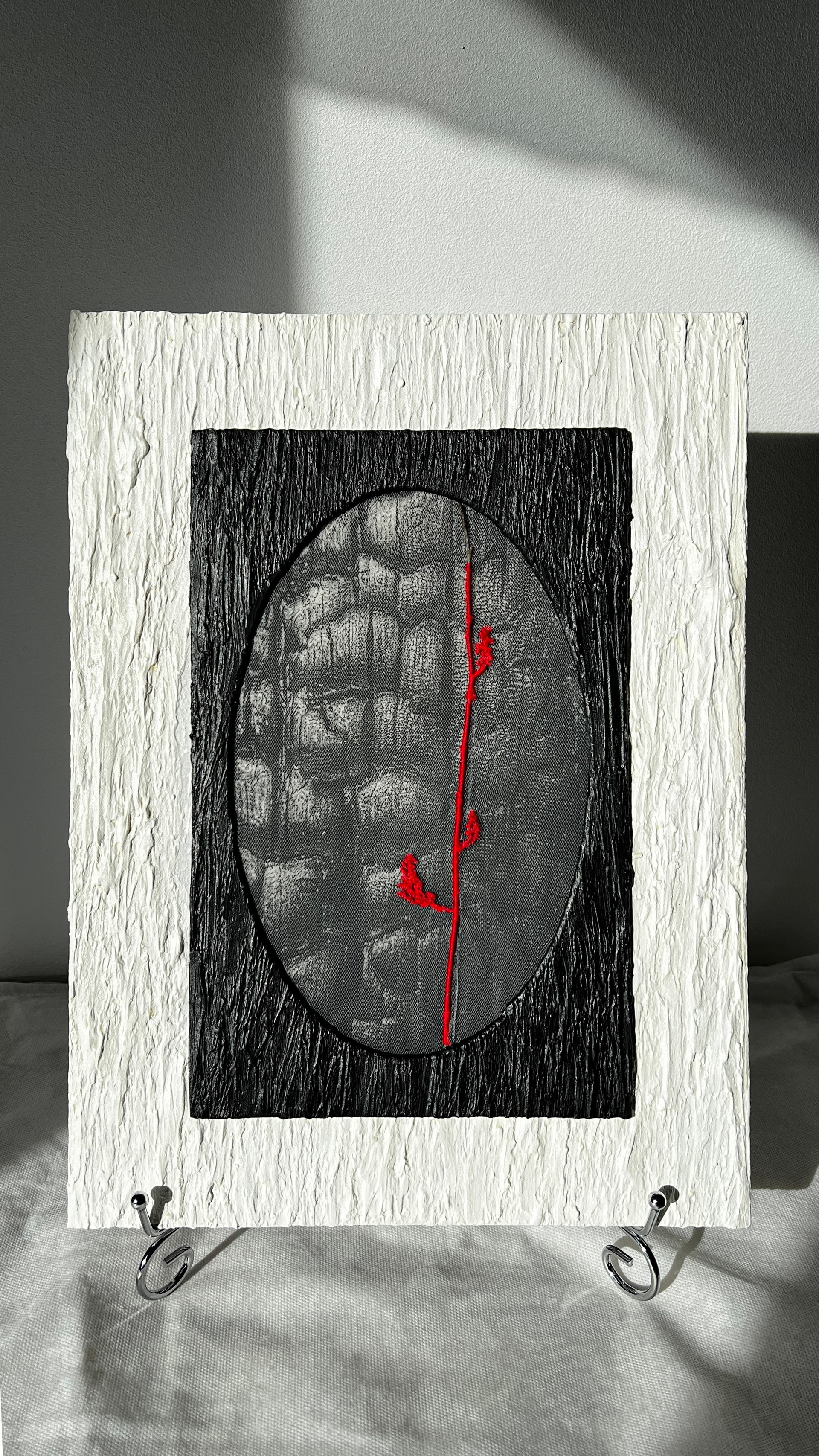 2026 год. Размер: 30 × 40 см. Техника: смешанная. Материалы: чёрно-белая фотоплёнка, печать на кальке, акварельная бумага, фатин, нить для вышивания, картон, оргалит, текстурная паста, акриловая краска, лессирующий воск. Цена по запросу