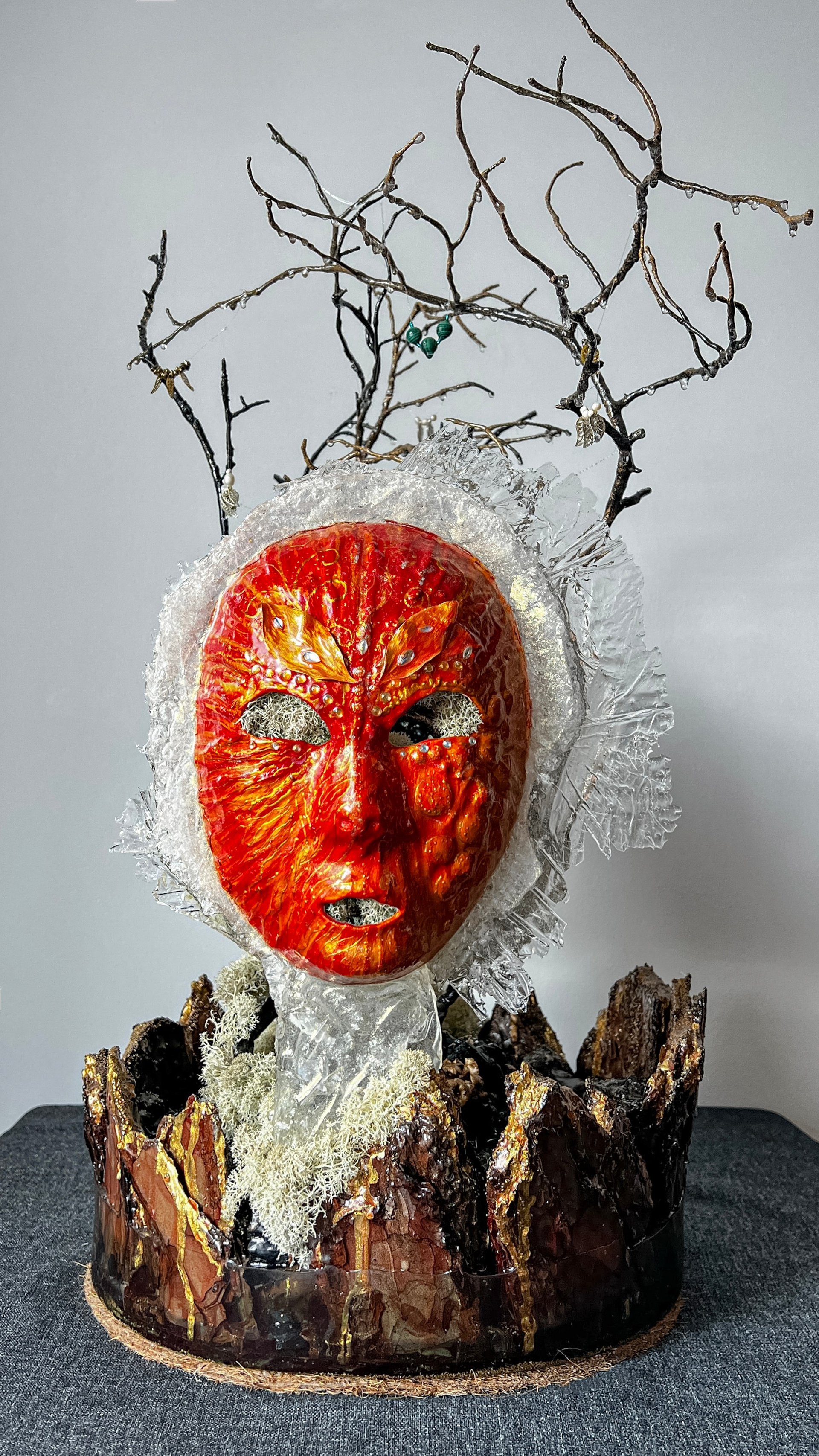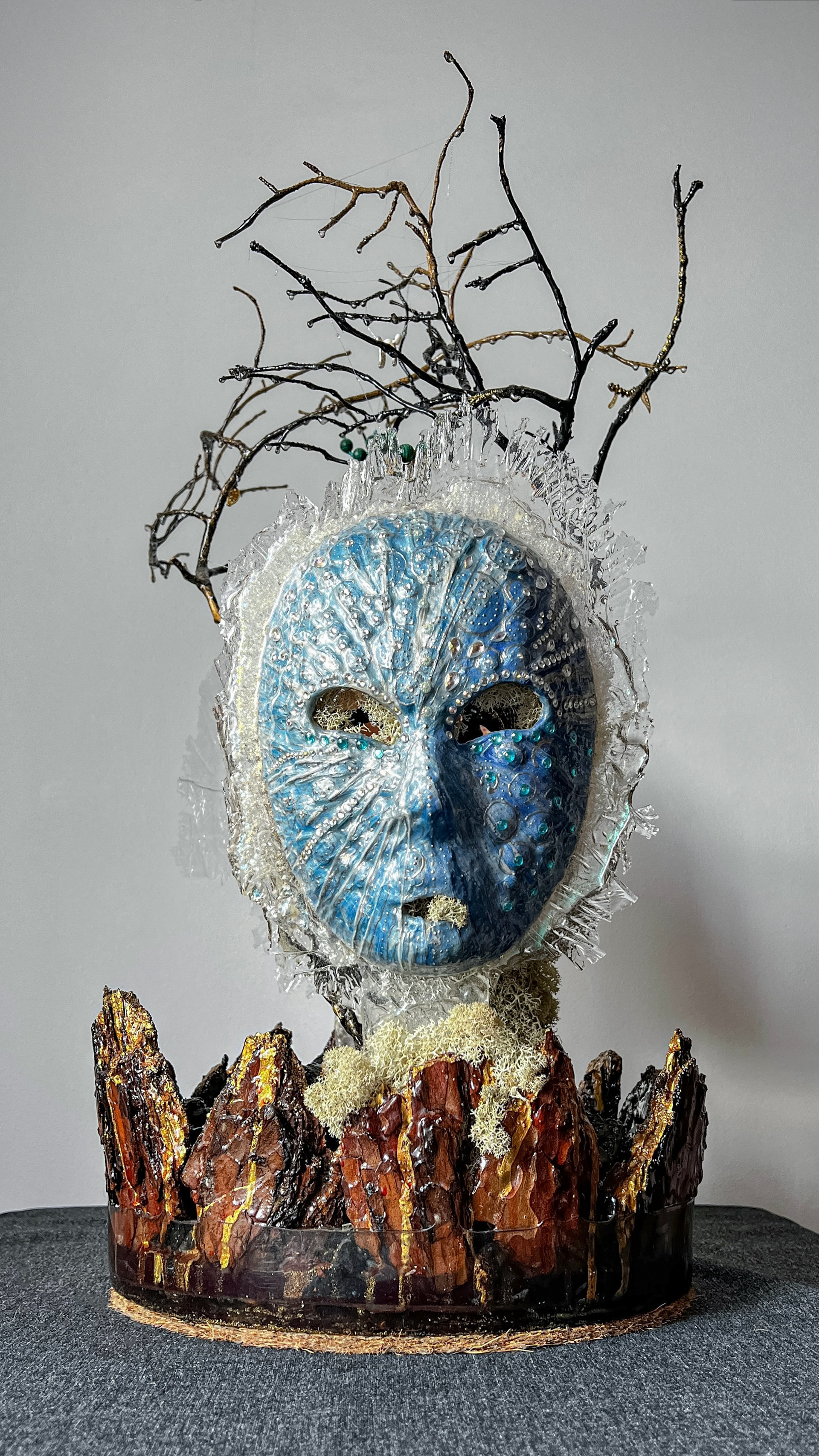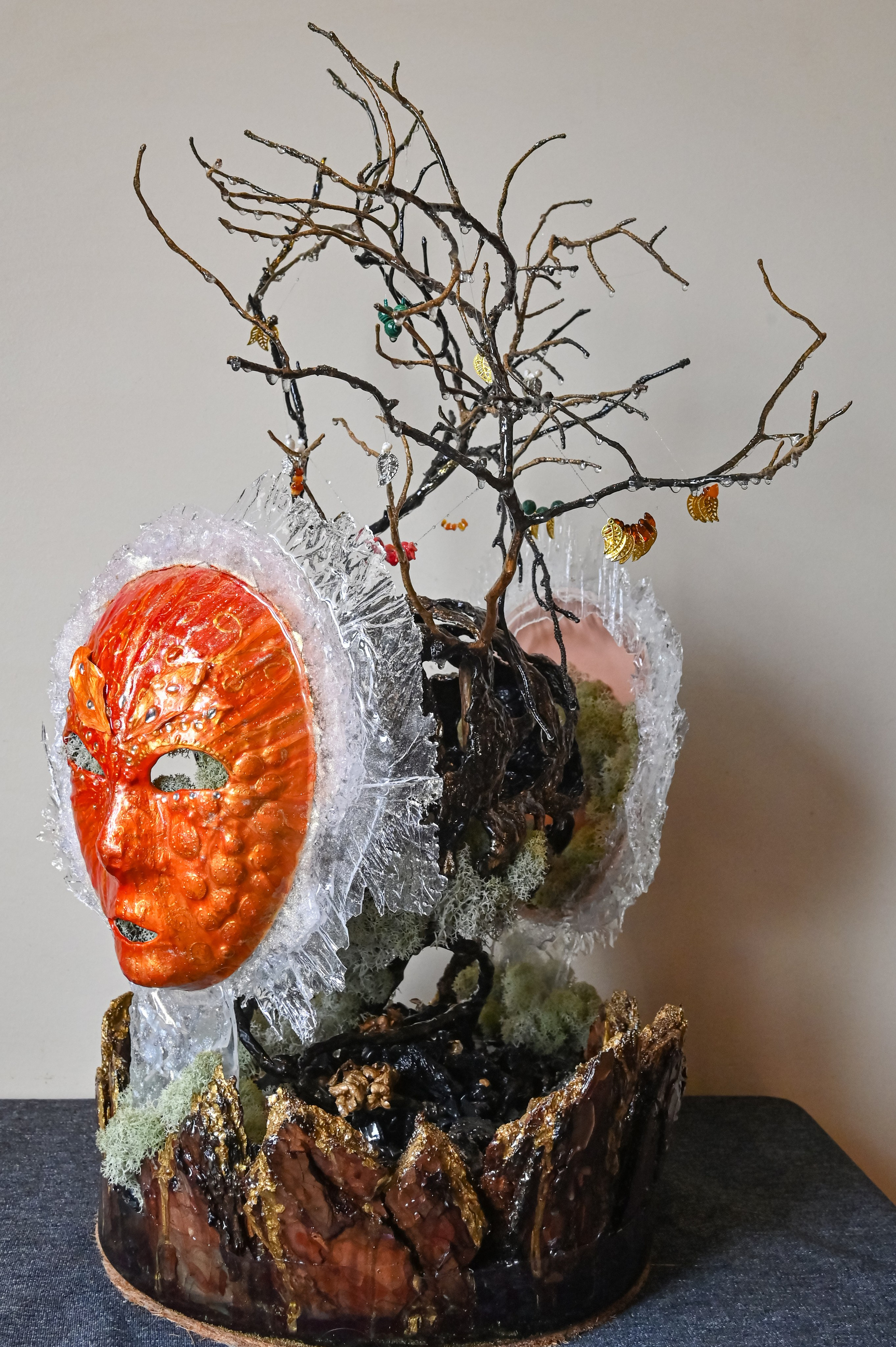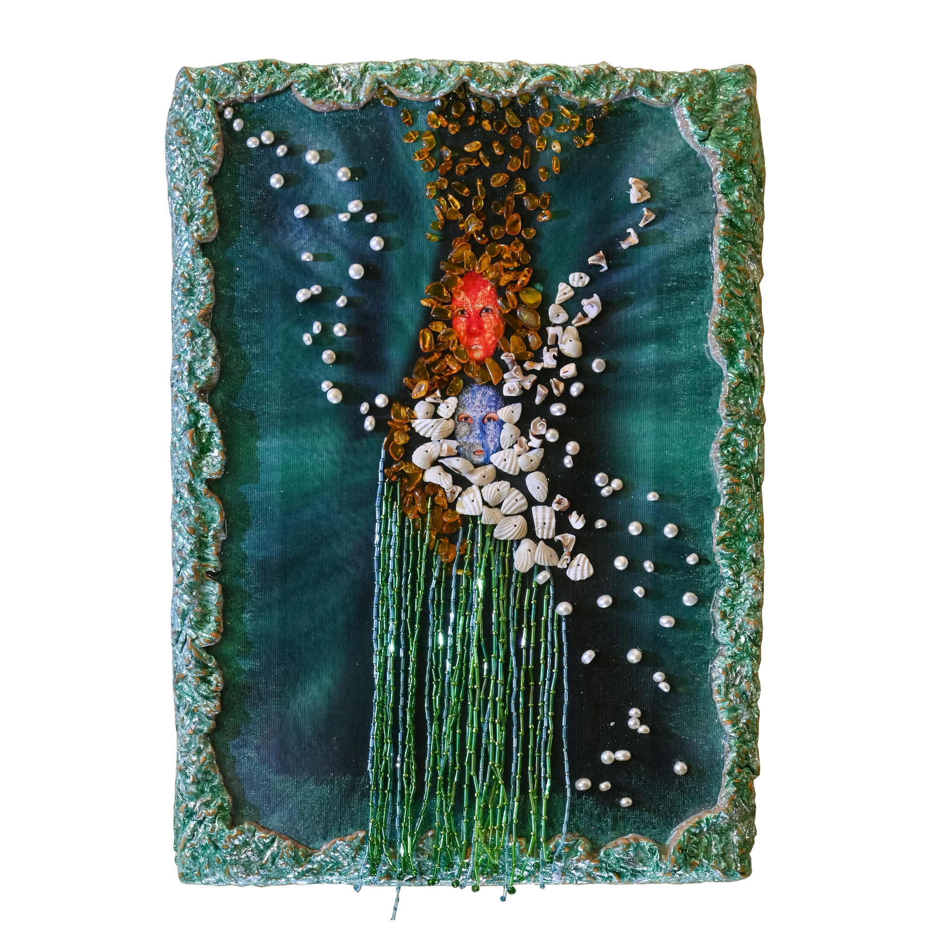 Маска становится метафорой, одновременно представляя и нашу индивидуальность, и наше единство. Используемые материалы — бисер, жемчуг, янтарь и коралл — олицетворяют богатство человеческих эмоций и связей.