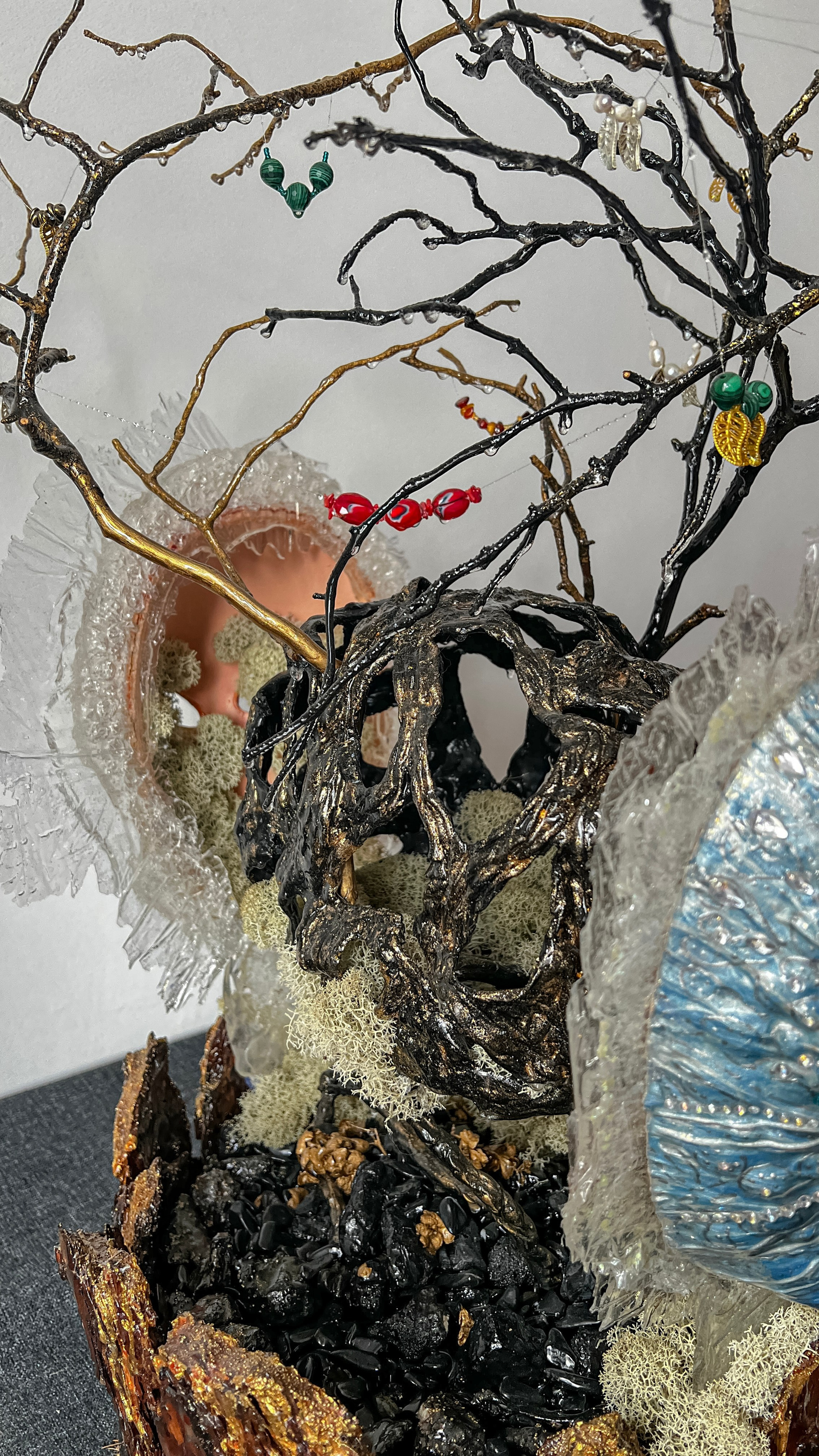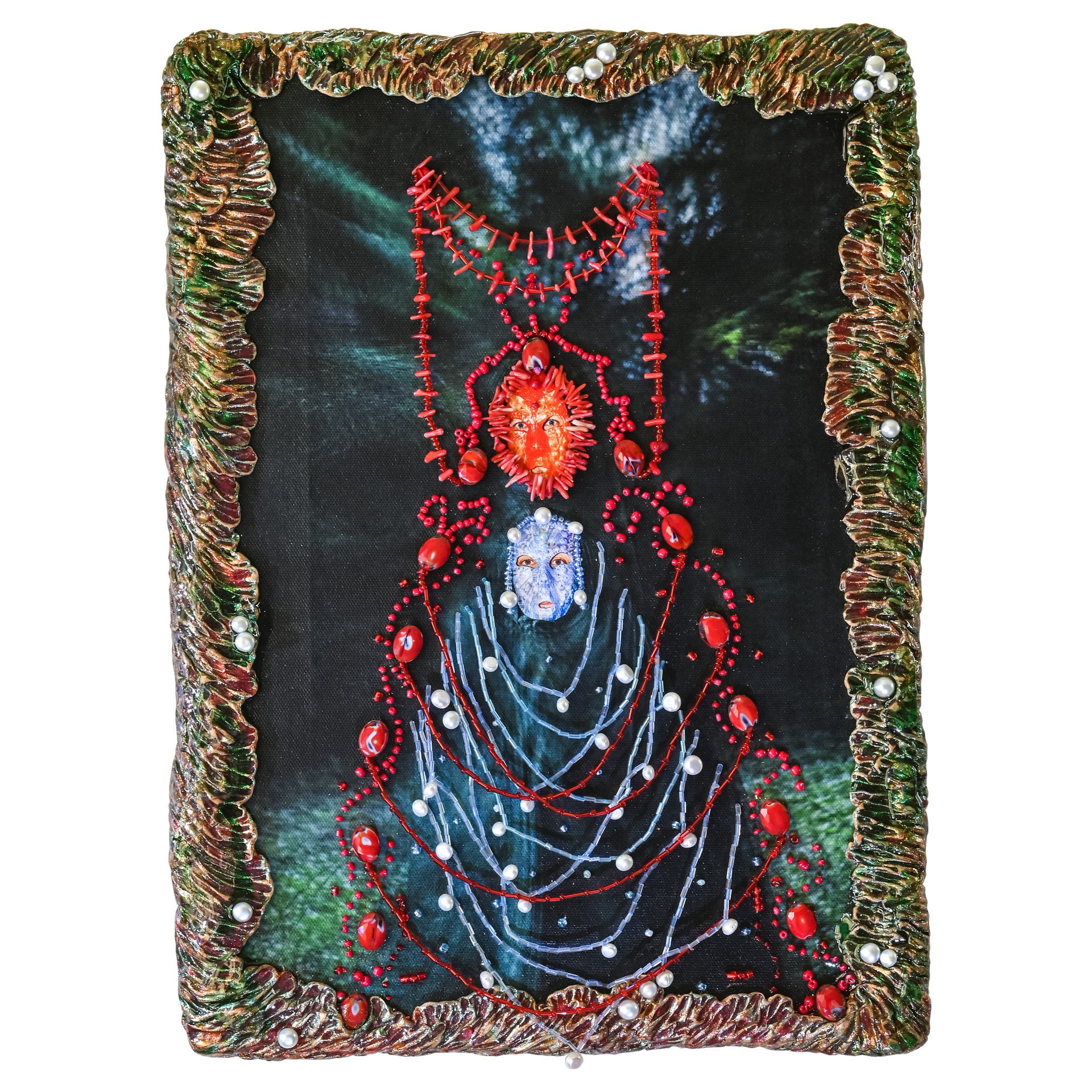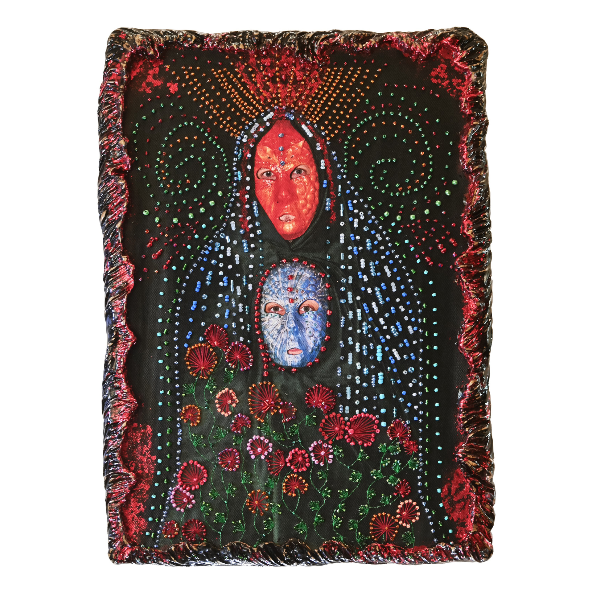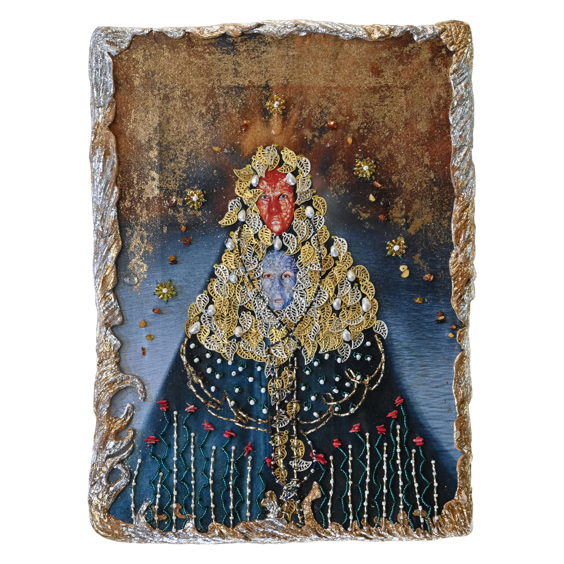 Маска становится метафорой, одновременно представляя и нашу индивидуальность, и наше единство. Используемые материалы — бисер, жемчуг, янтарь и коралл — олицетворяют богатство человеческих эмоций и связей.