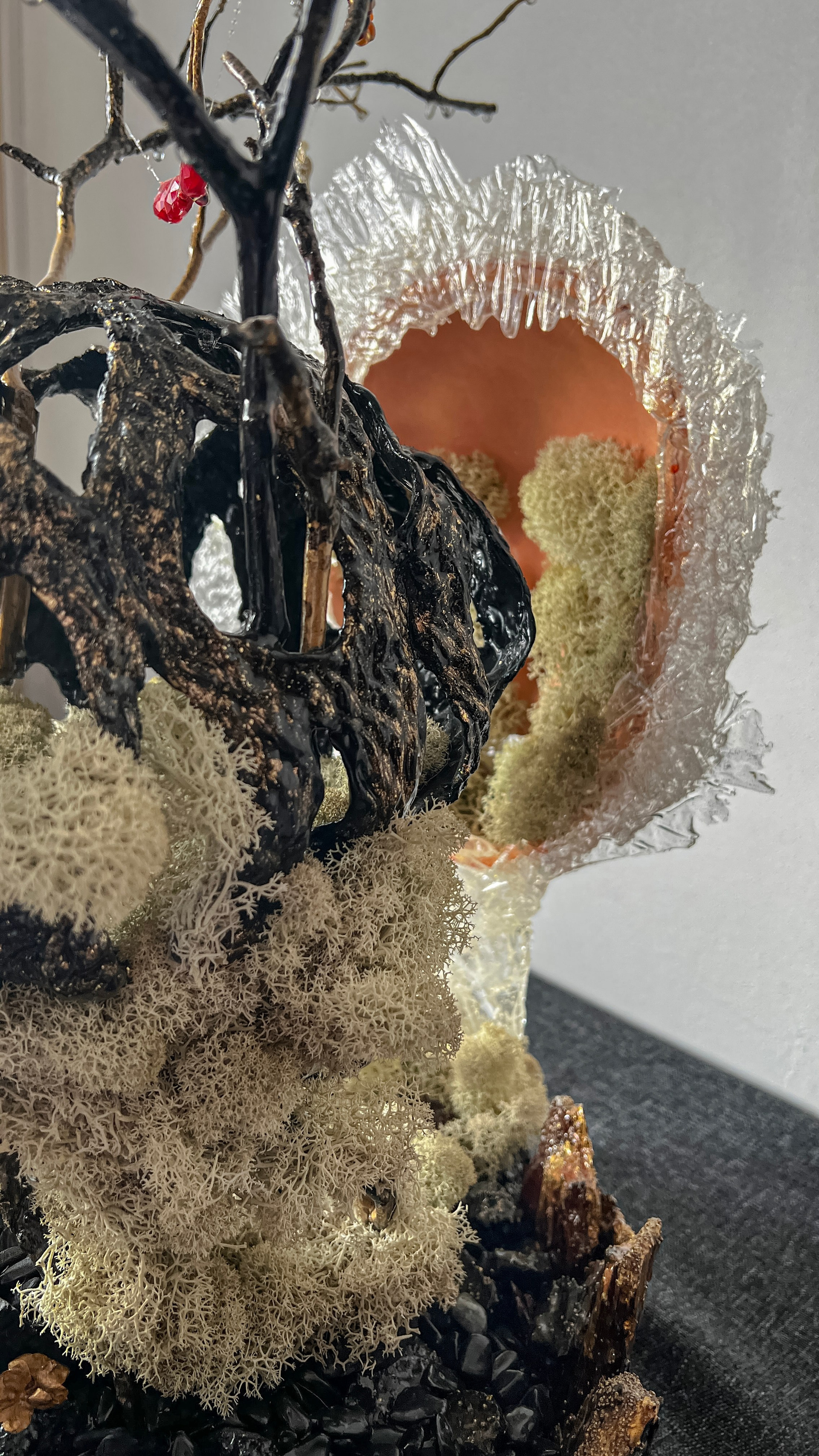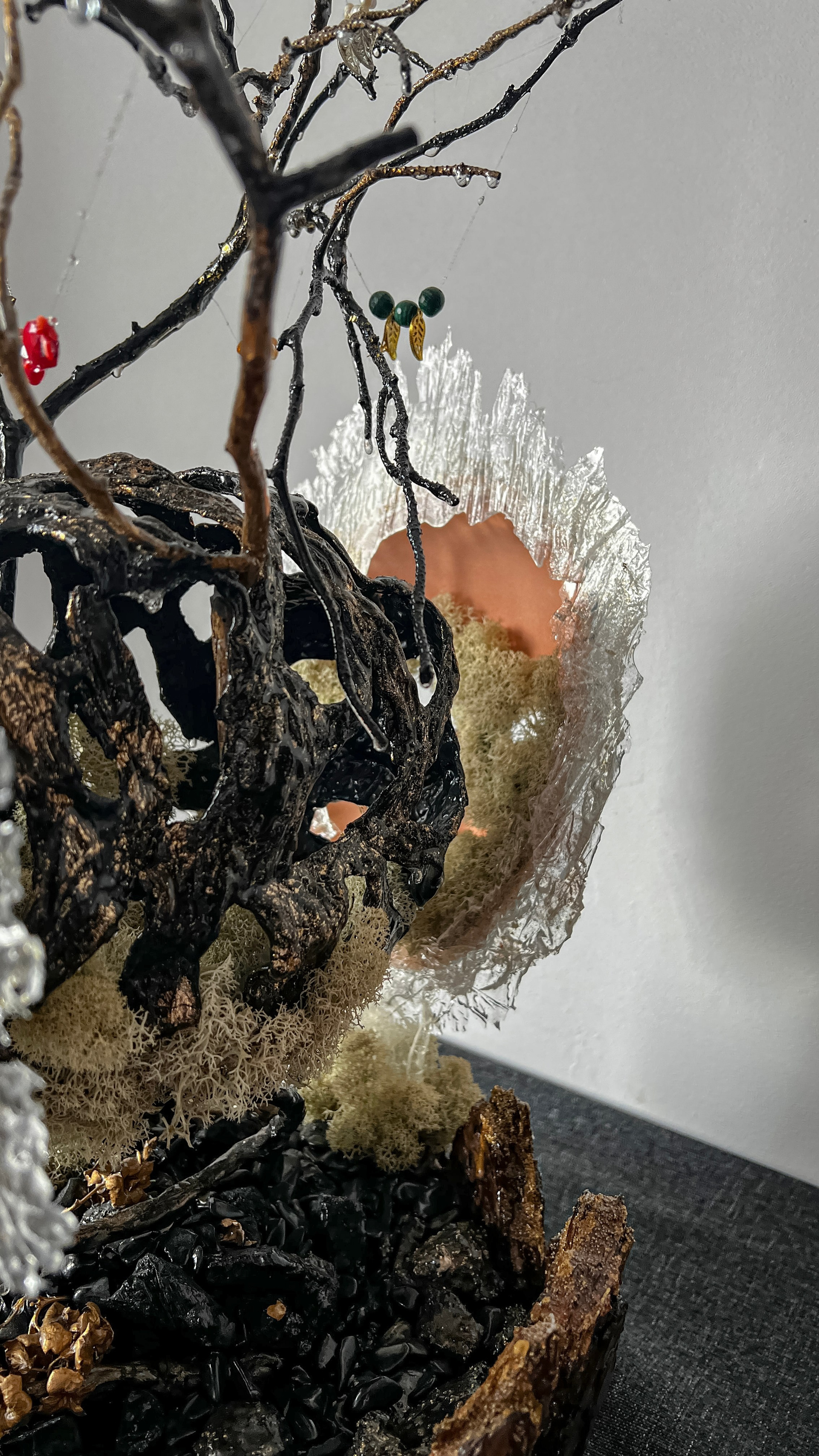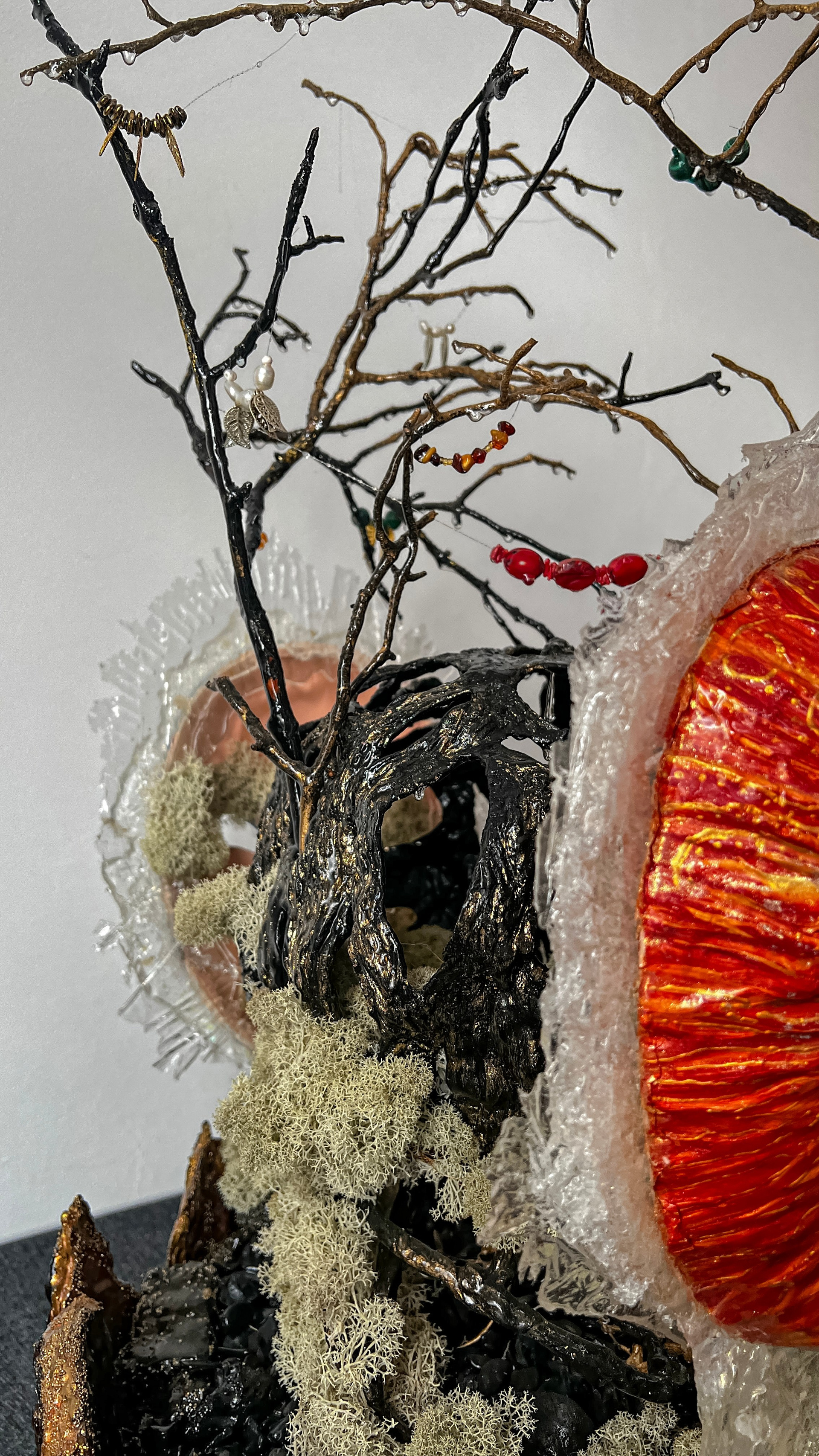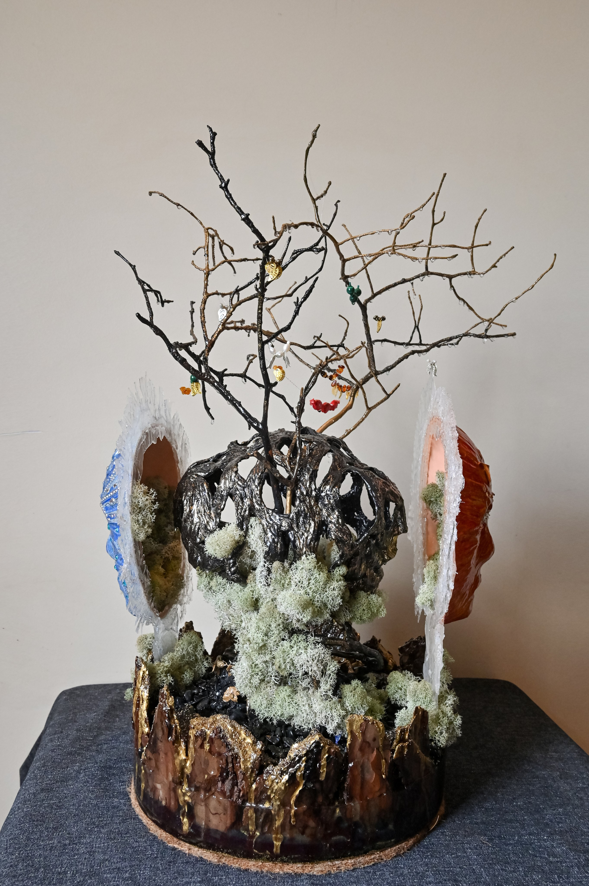 Маска становится метафорой, одновременно представляя и нашу индивидуальность, и наше единство. Используемые материалы — бисер, жемчуг, янтарь и коралл — олицетворяют богатство человеческих эмоций и связей.